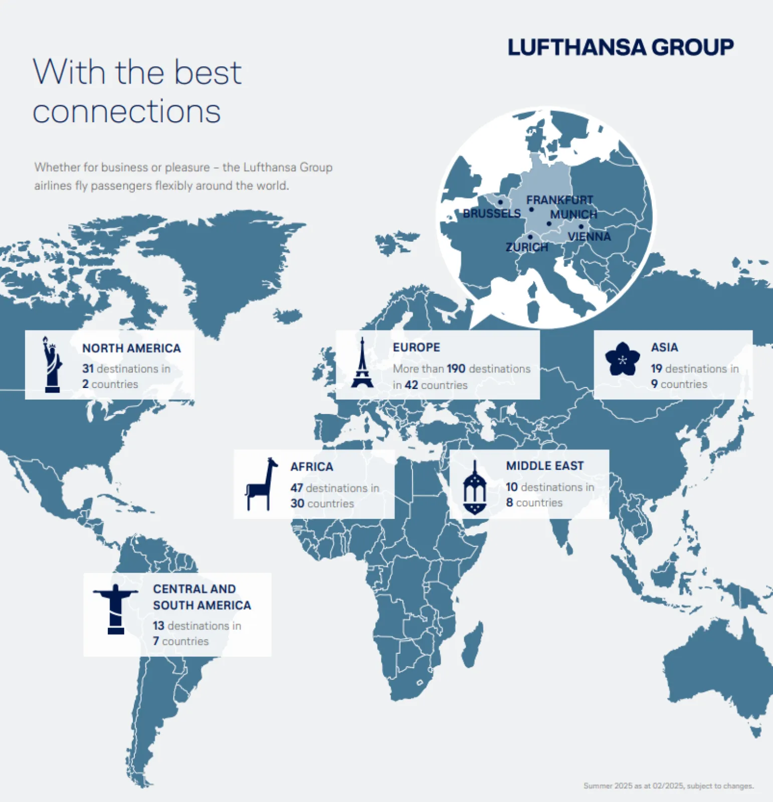 Do you already know where your company’s next business trip will be? Or do you want to make sure that your customers’ favorite destinations are included in our flight schedule? Then take a look right now at the Lufthansa Group’s route network and look forward to limitless connections.
